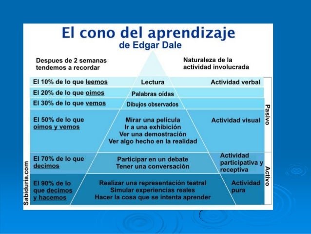 Se explicó el diagrama triangular de Edgar Dale, en el cual narra que el mejor aprendizaje se logra cuando el estudiante concentra sus actividades, lo que implica que la clase debe ser interactiva para lograr sus objetivos.